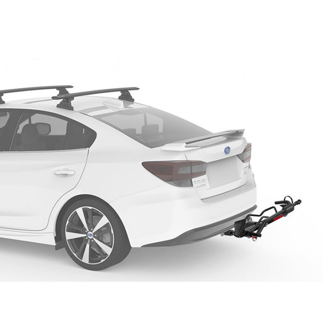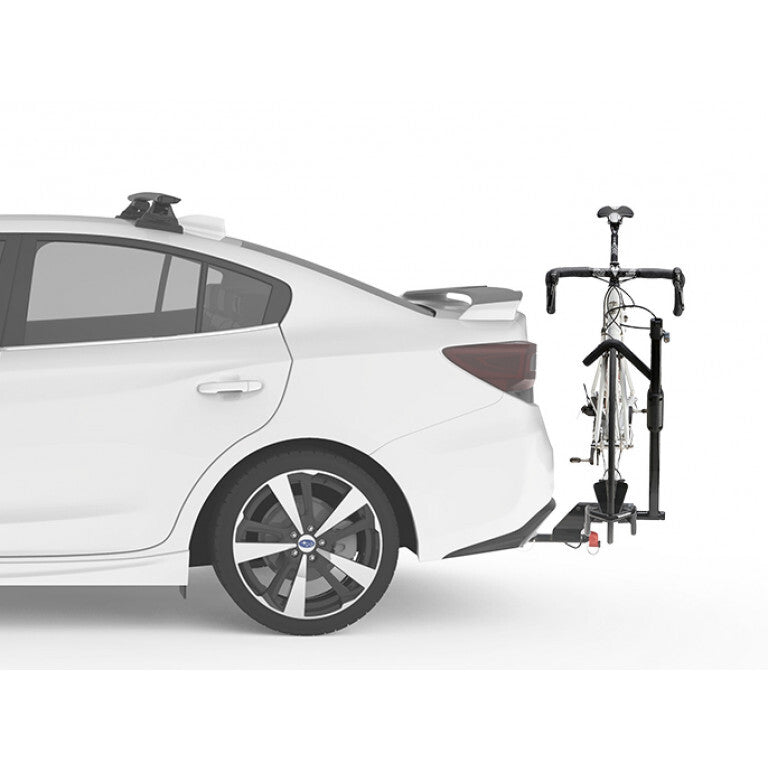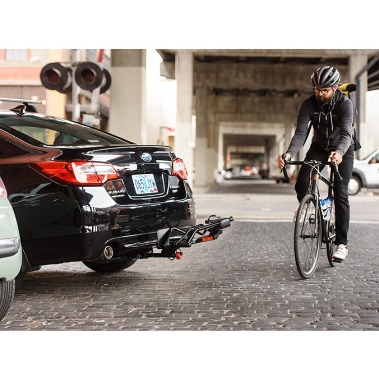 - Lightweight, hitch mounted tray rack that carries one bike without frame contact