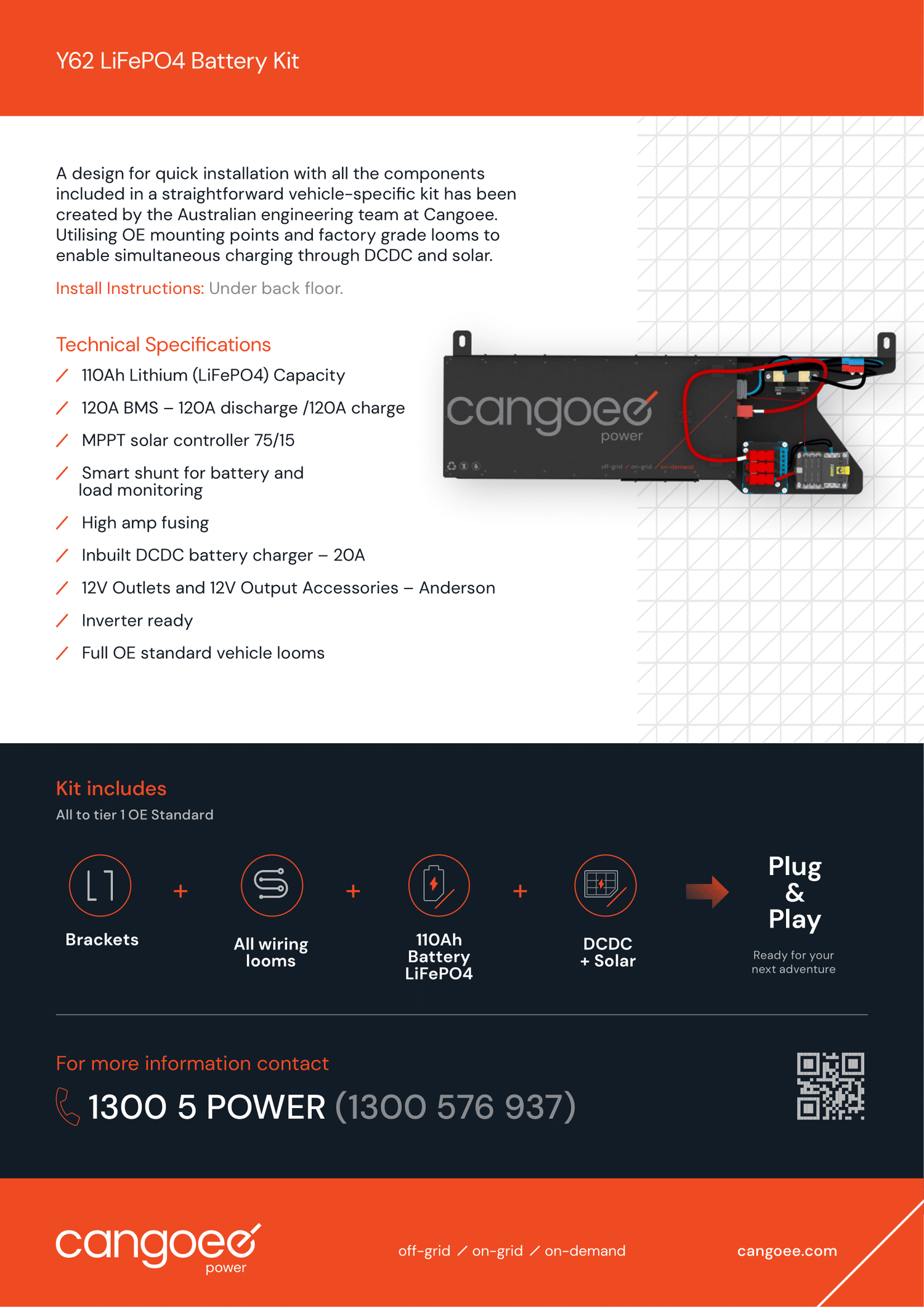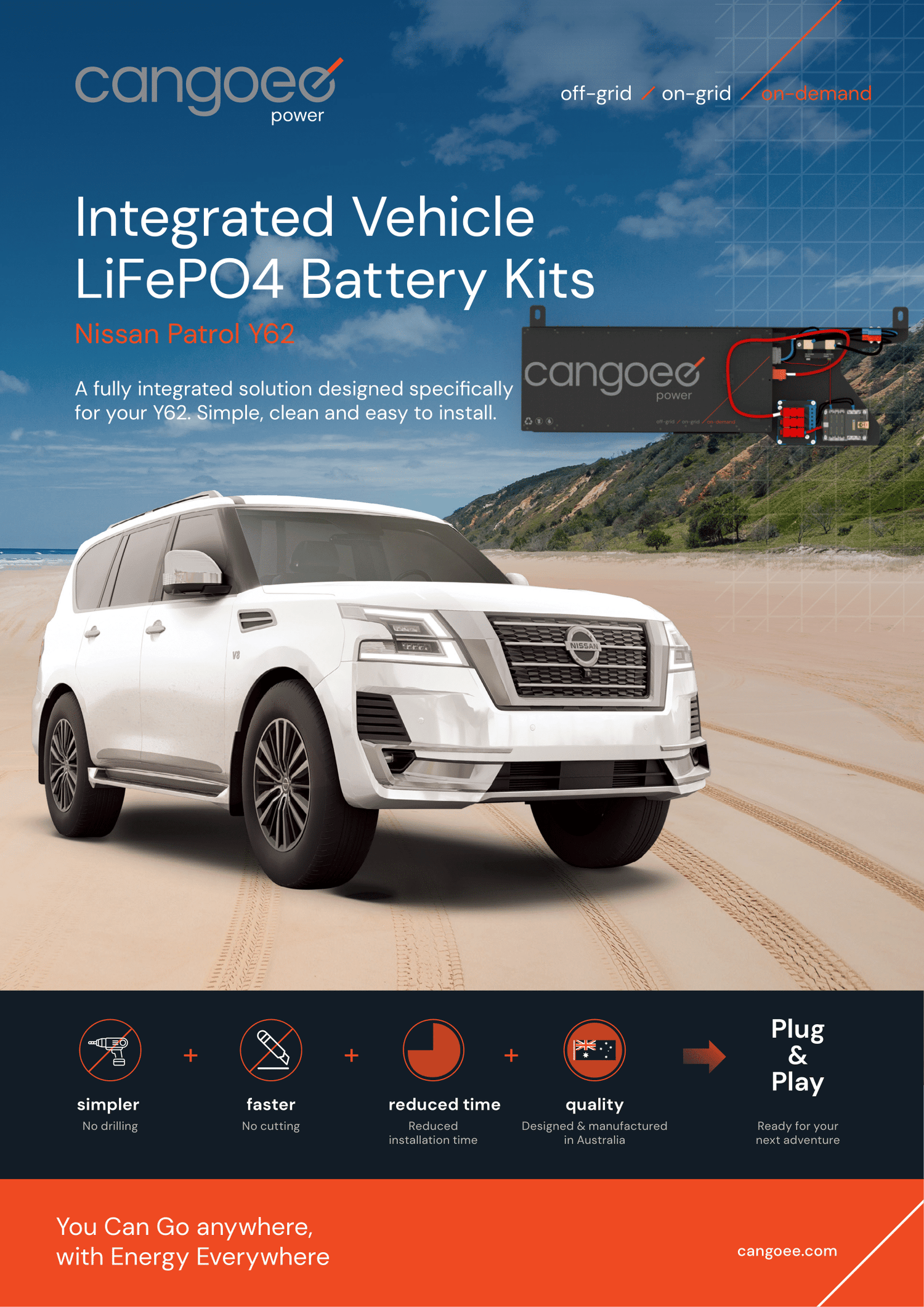 Upgrade your Nissan Patrol Y62 with the Cangoee Lithium Auxiliary Battery Kit and experience superior power, efficiency, and reliability. Perfect for off-grid adventures and demanding conditions, this kit ensures you're always ready for the journey ahead.