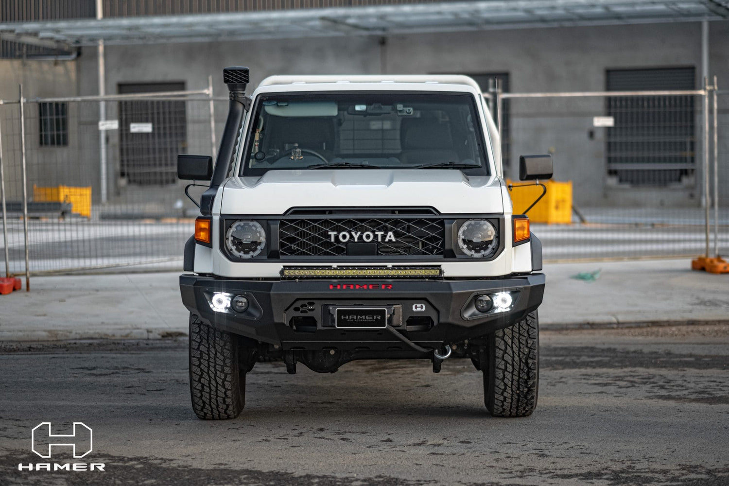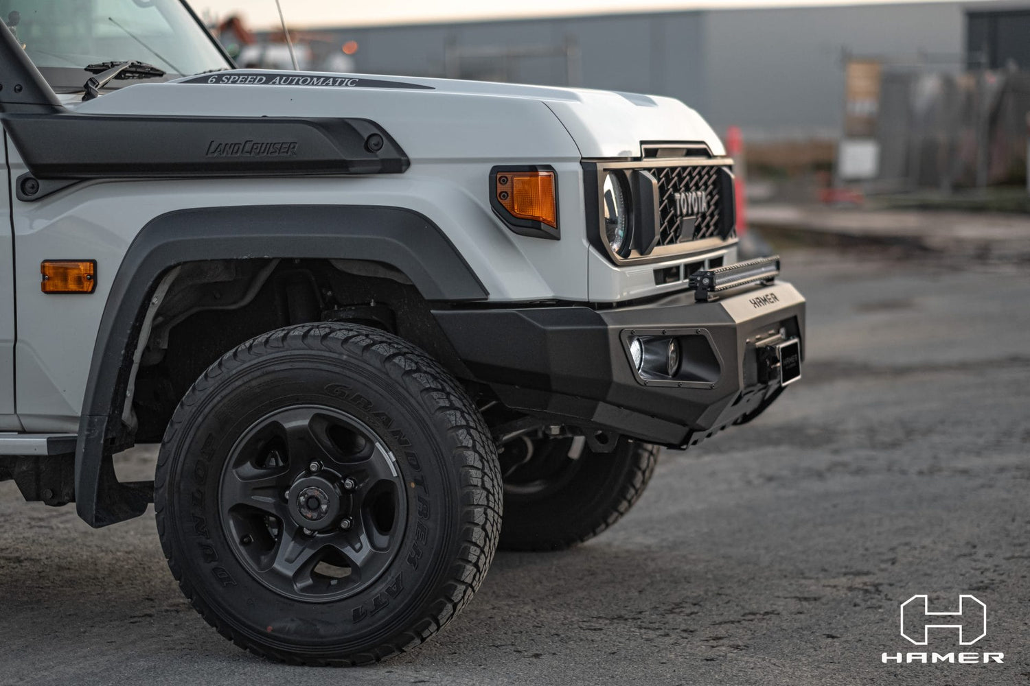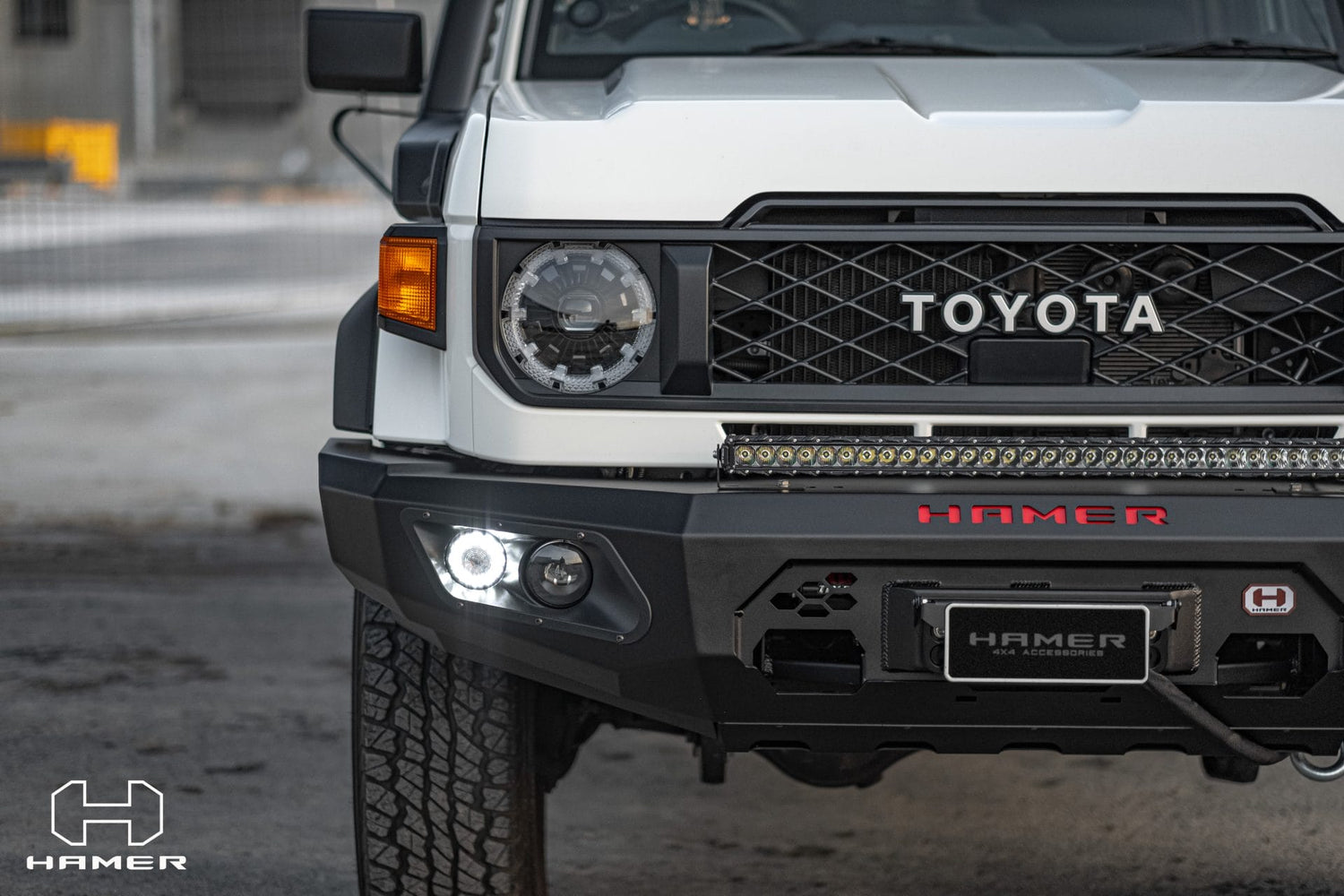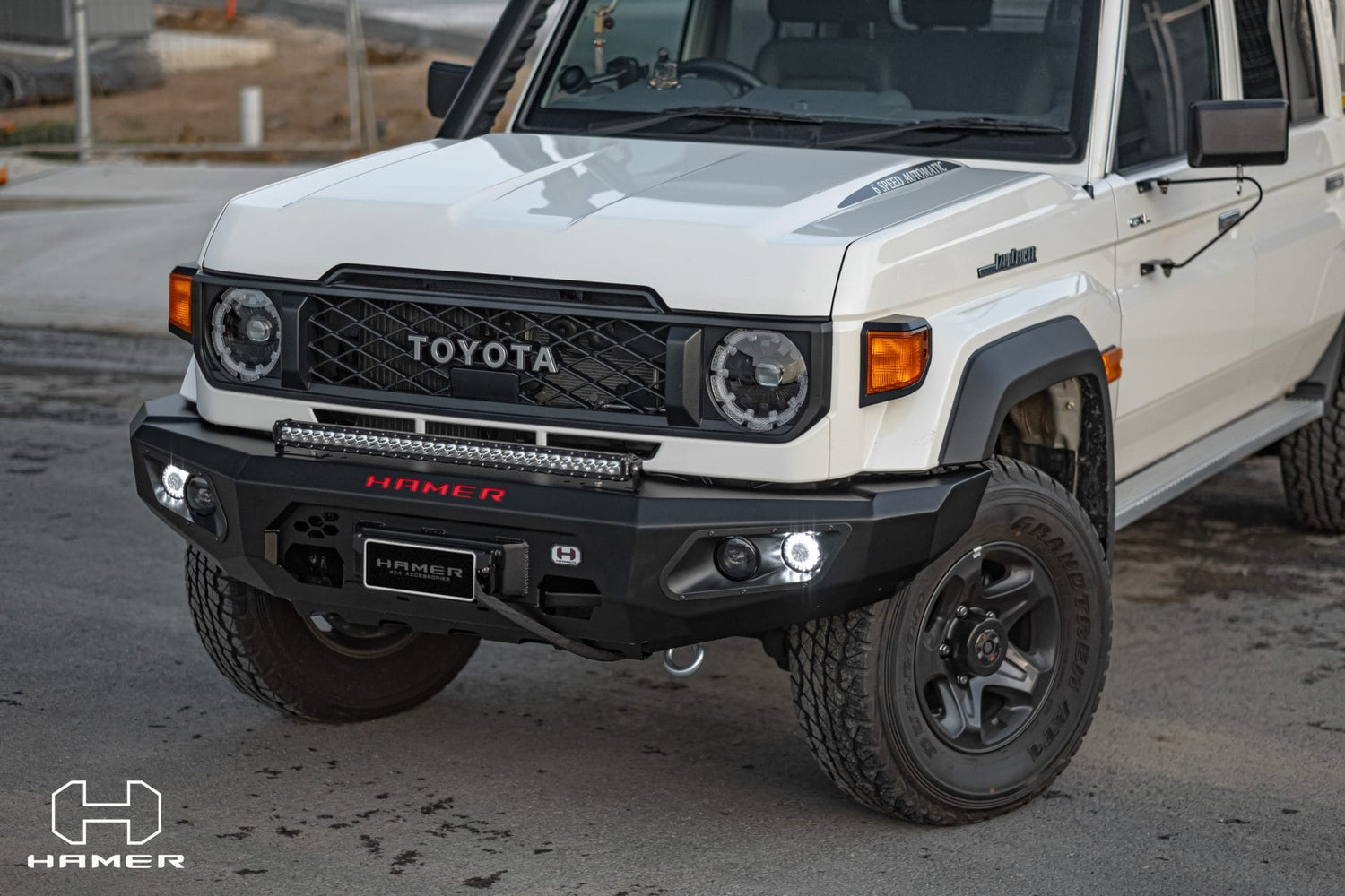 Hamer King series bull bar is a bumper replacement bull bar that has been specifically designed to fit Toyota 70 Series ( 2023 – Present ). Not only adding a tough look to your vehicle, Hamer bull bar protects the front of your vehicle during an unexpected event. Stay confident in every journey you make.