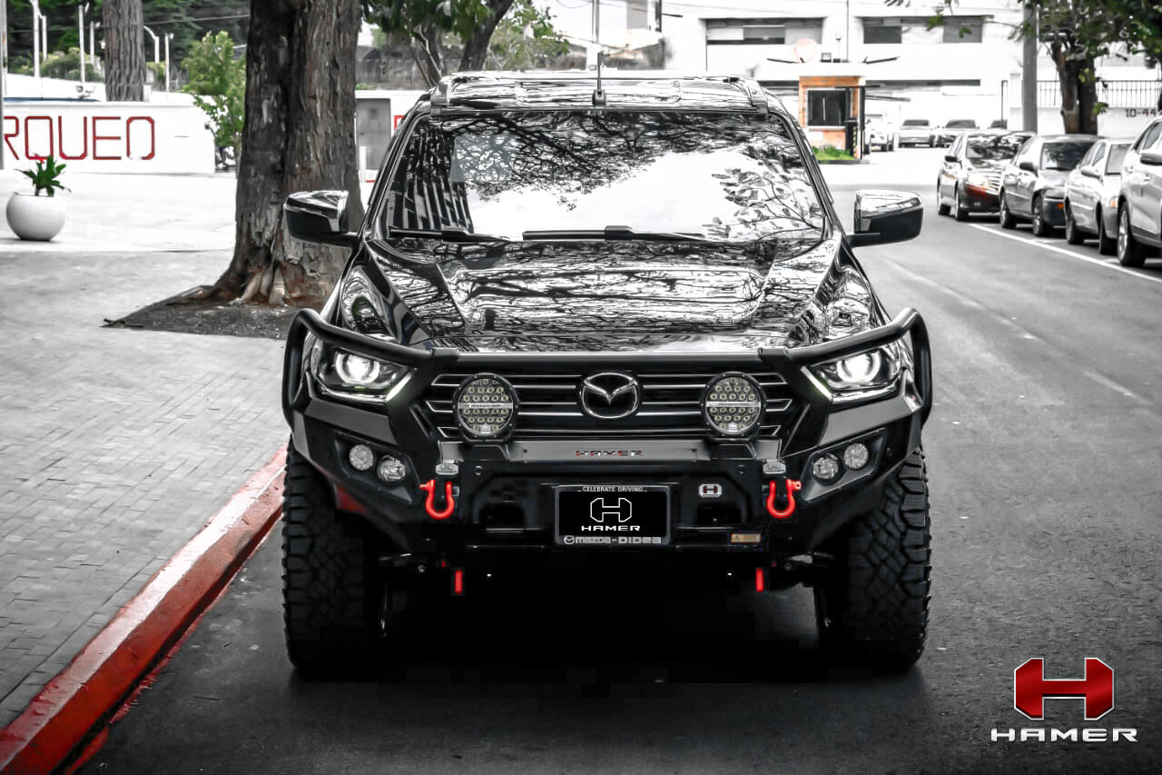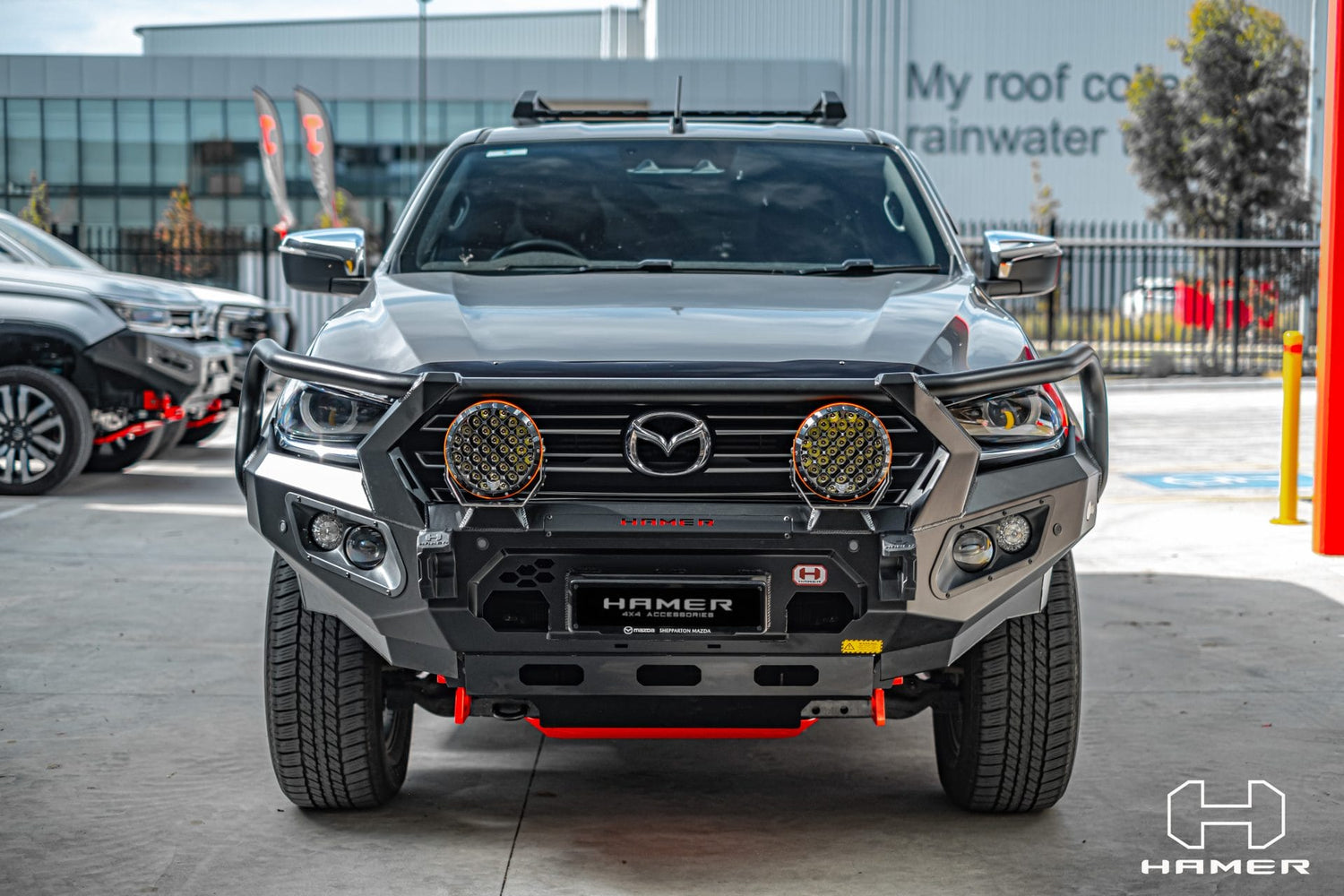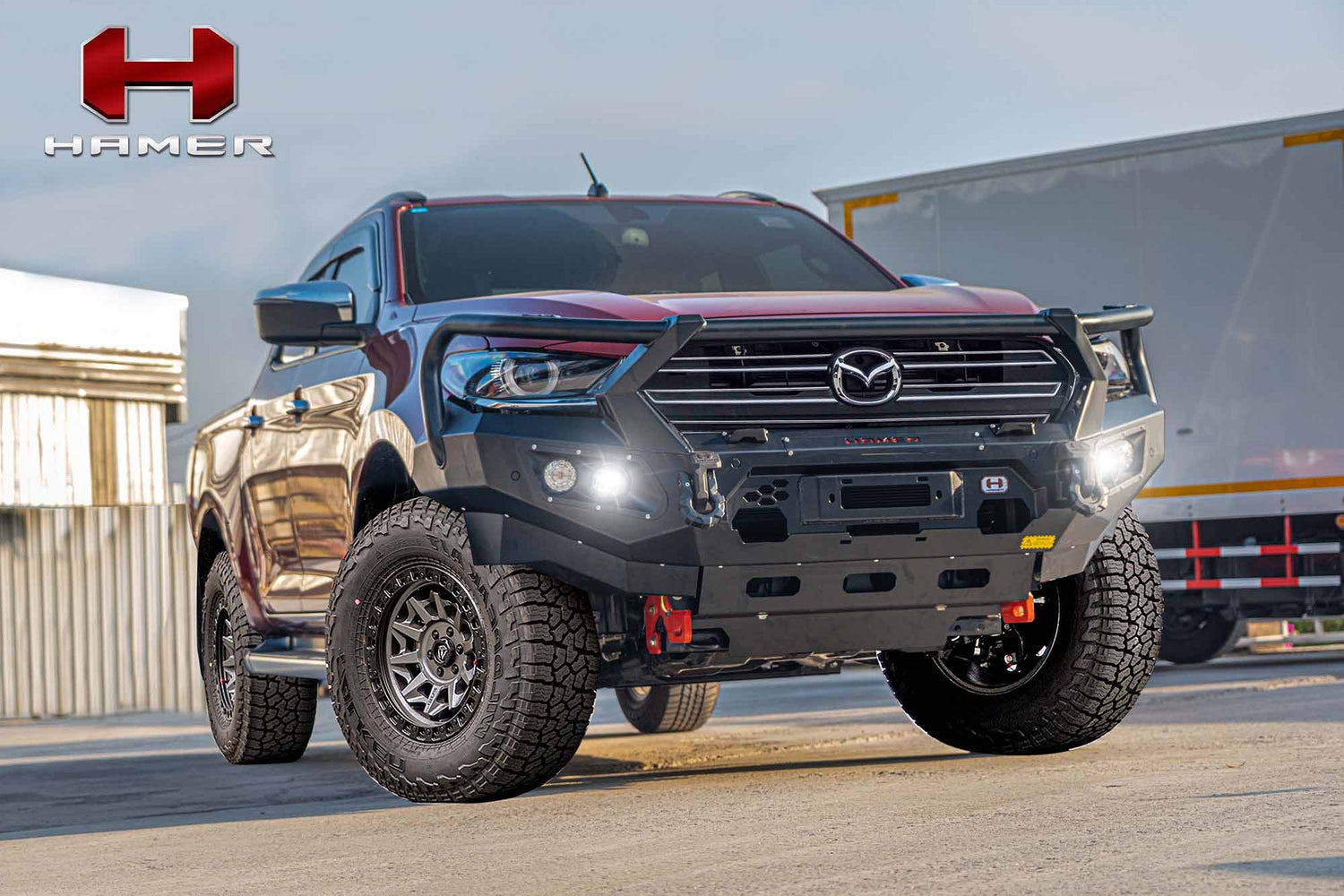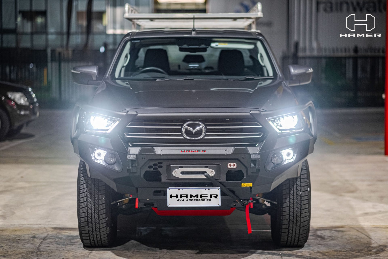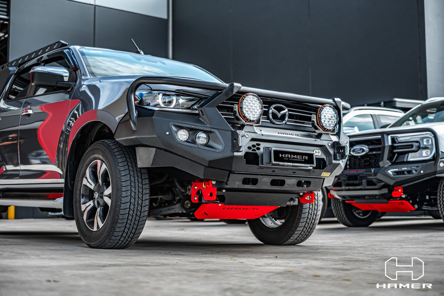 Hamer King series Plus bull bar is a bumper replacement bull bar that has been specifically designed to fit Mazda BT-50 ( 2021 – Present ). Not only adding a tough look to your vehicle, Hamer bull bar protects the front of your vehicle during an unexpected event. Stay confident in every journey you make.