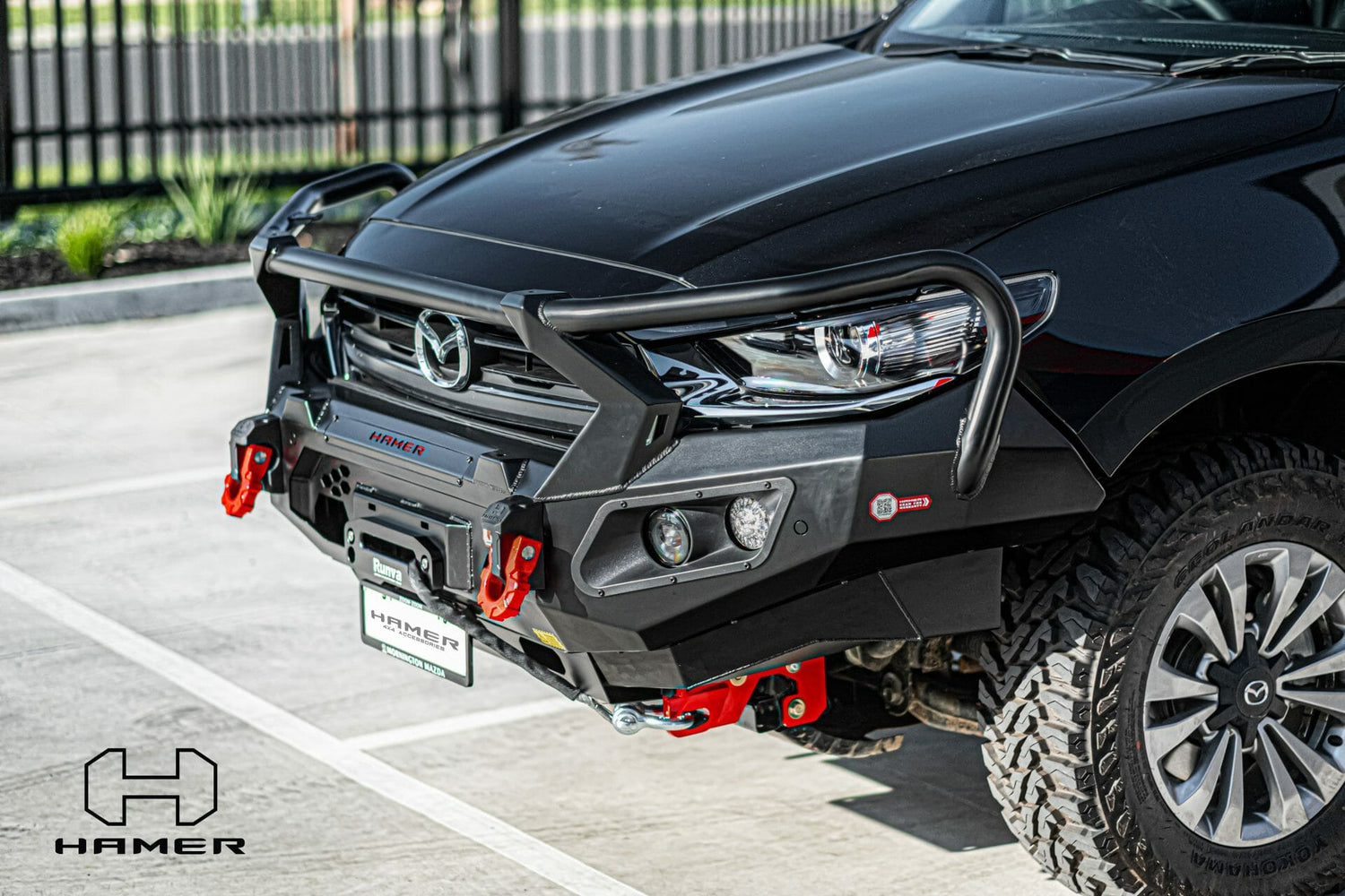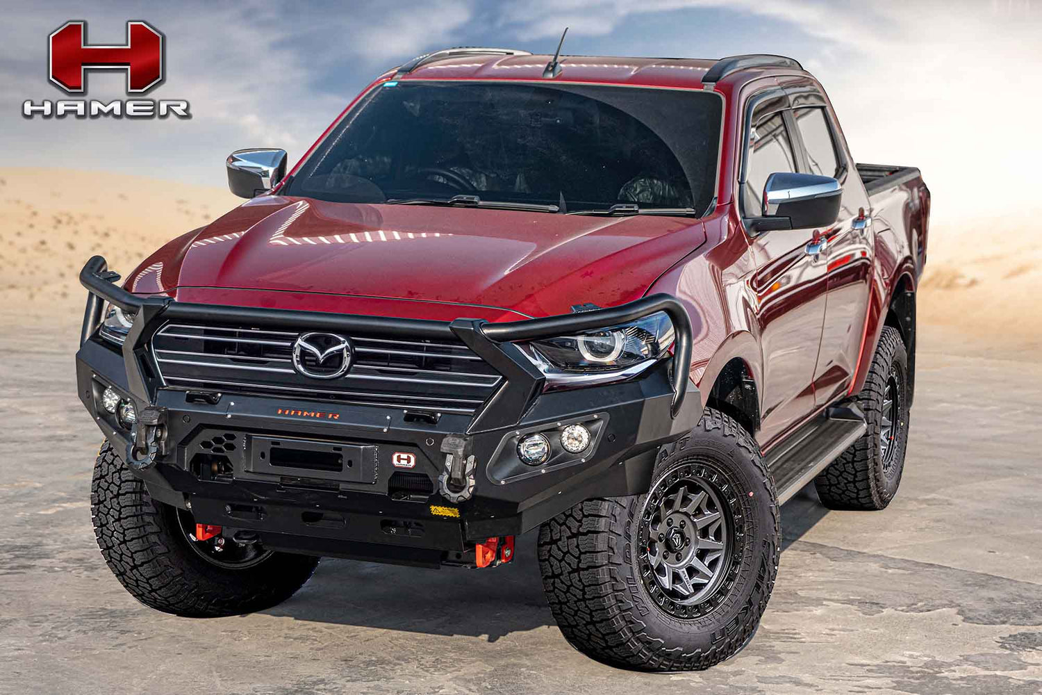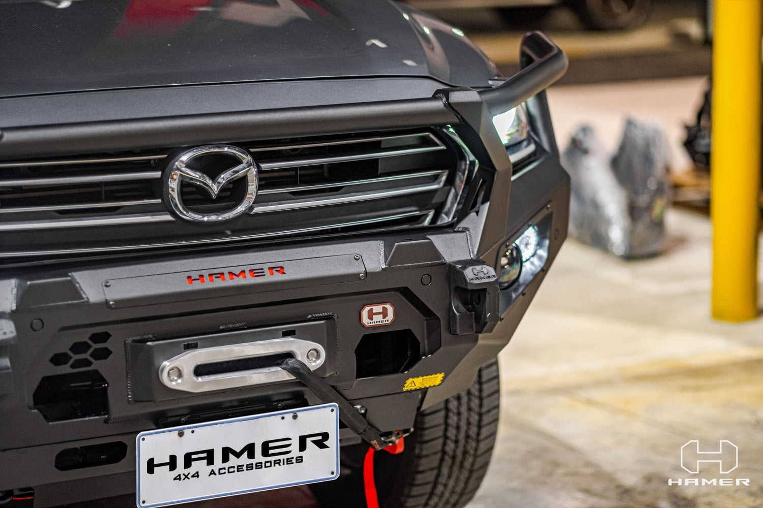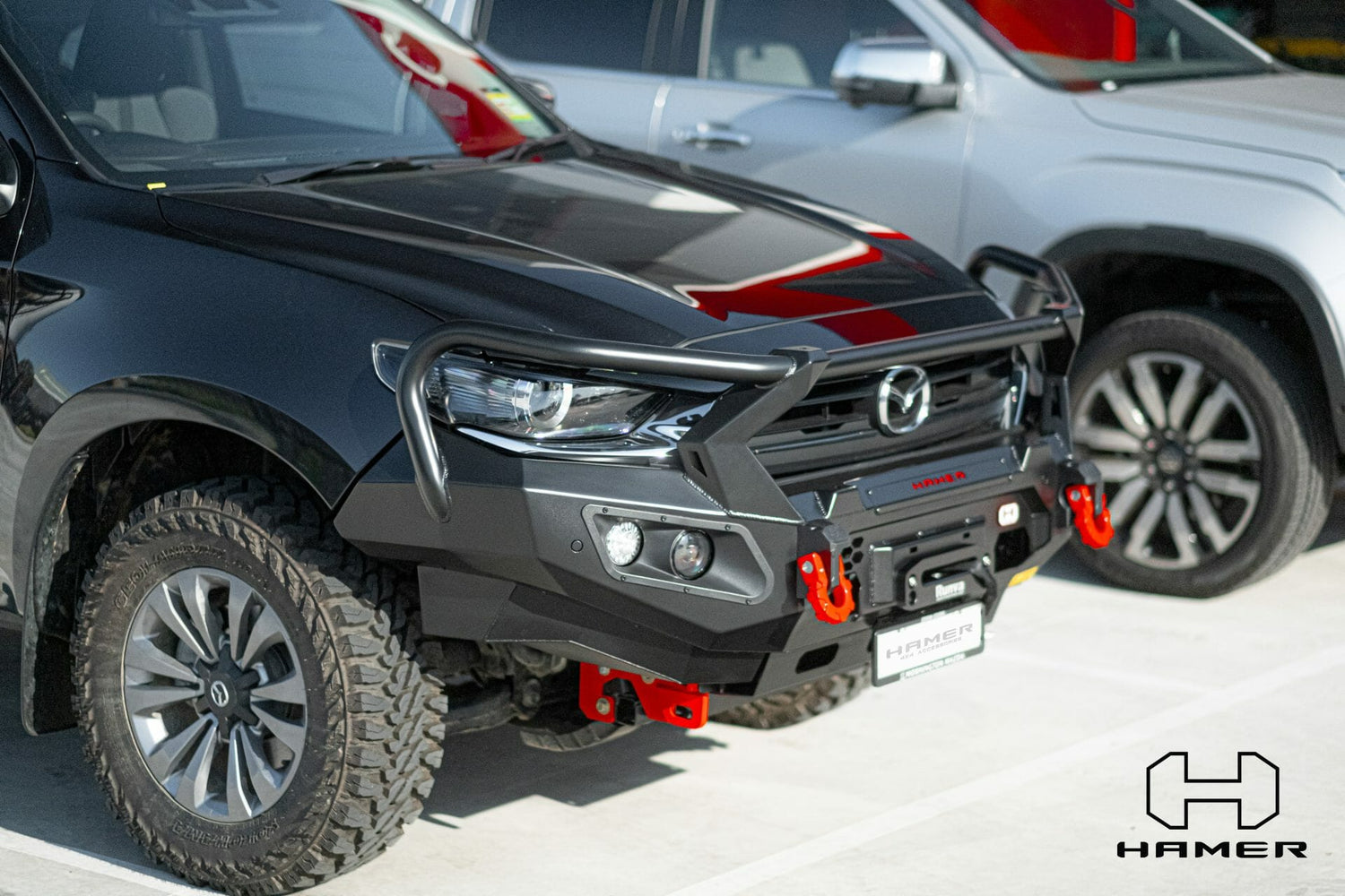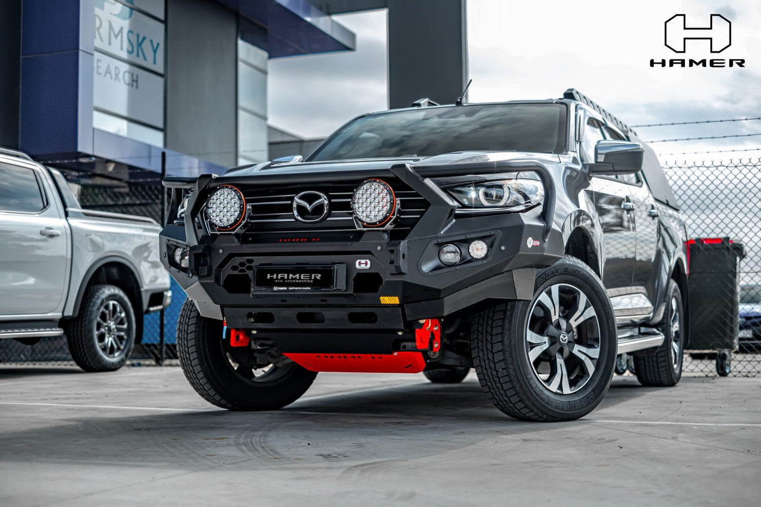 Hamer King series Plus bull bar is a bumper replacement bull bar that has been specifically designed to fit Mazda BT-50 ( 2021 – Present ). Not only adding a tough look to your vehicle, Hamer bull bar protects the front of your vehicle during an unexpected event. Stay confident in every journey you make.