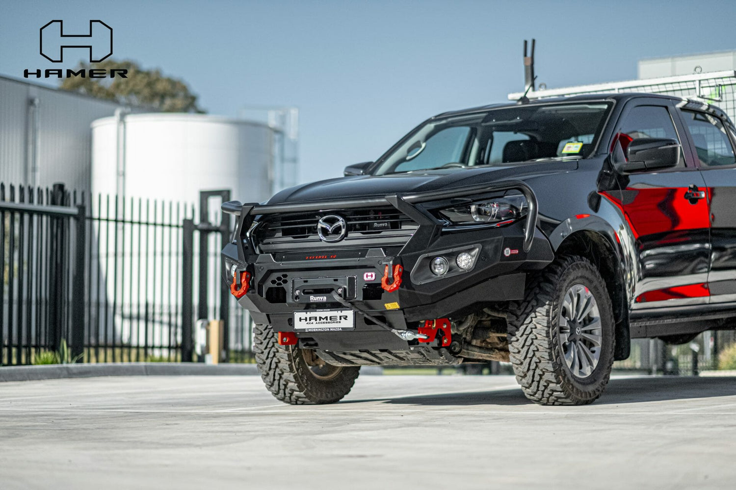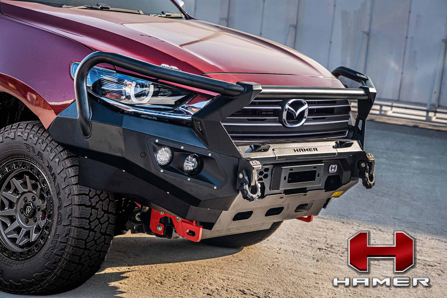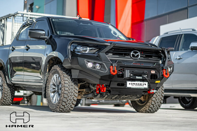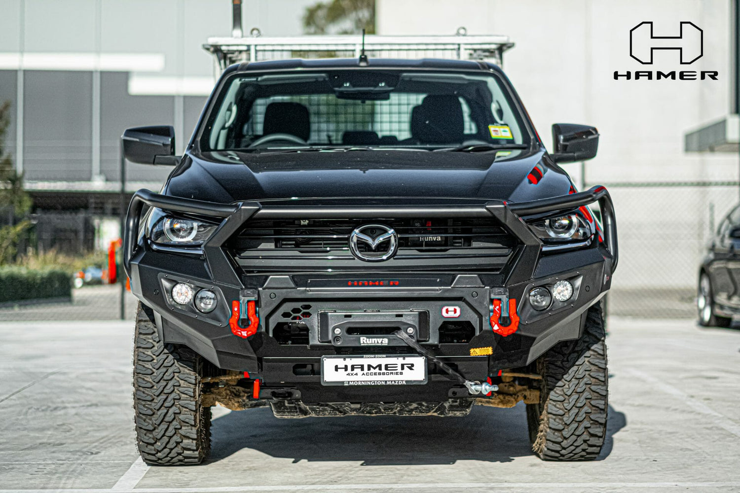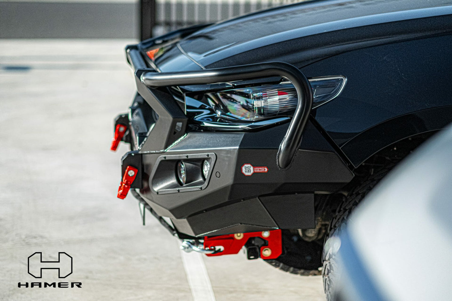 Hamer King series Plus bull bar is a bumper replacement bull bar that has been specifically designed to fit Mazda BT-50 ( 2021 – Present ). Not only adding a tough look to your vehicle, Hamer bull bar protects the front of your vehicle during an unexpected event. Stay confident in every journey you make.