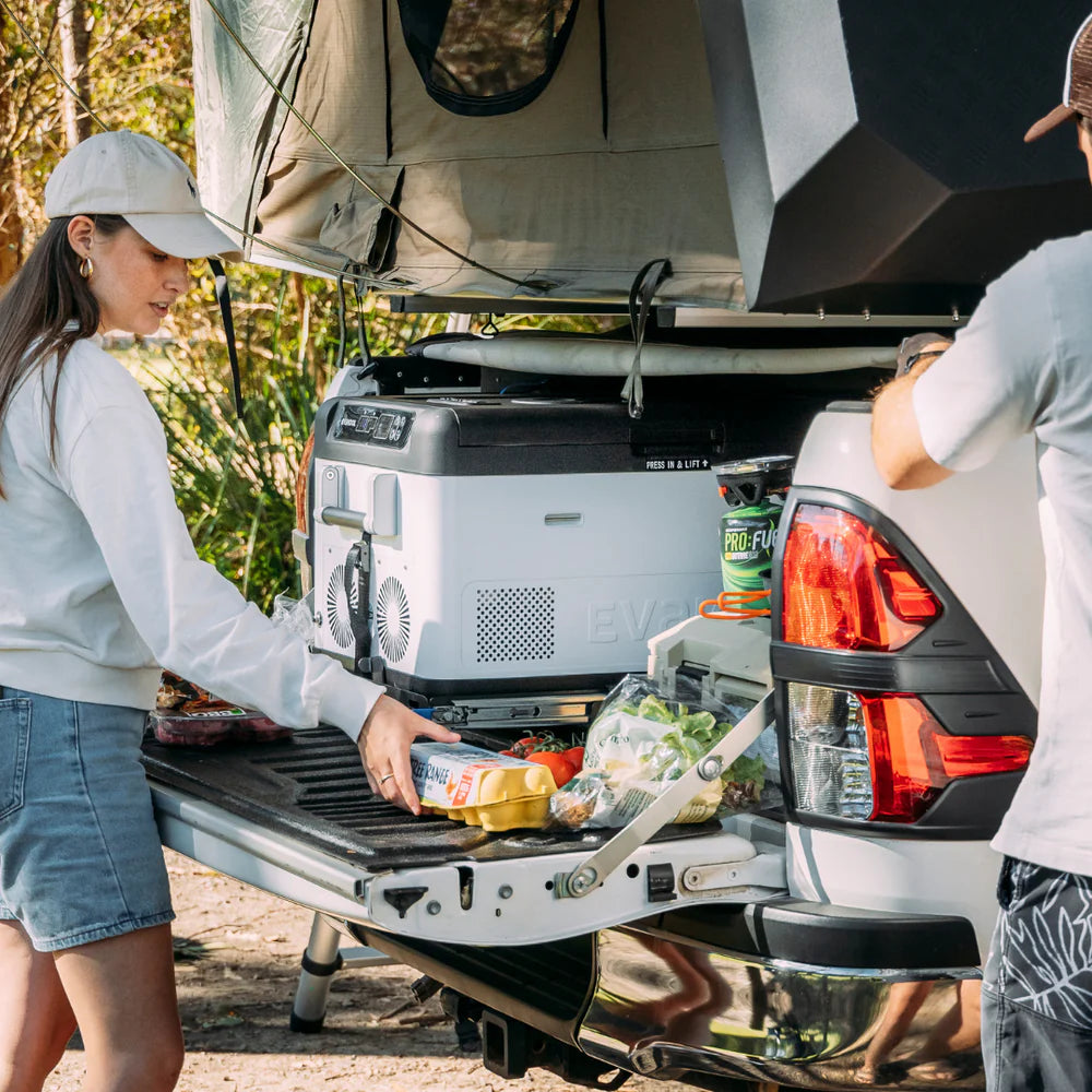 Fits most utes with a roller or hard-top cover. The fridge is 410mm in total height. If you’re wanting to add a fridge slide, our small heavy-duty fridge slide would add an extra 30-35mm making the total height 440-445mm!