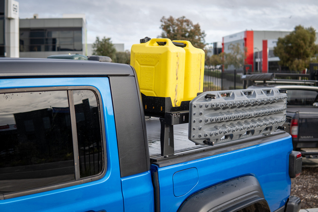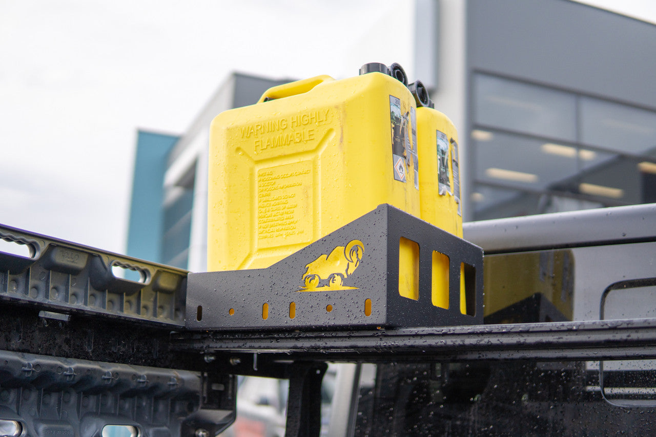 Dual Jerry Can holder Holding them in the standard upright orientation