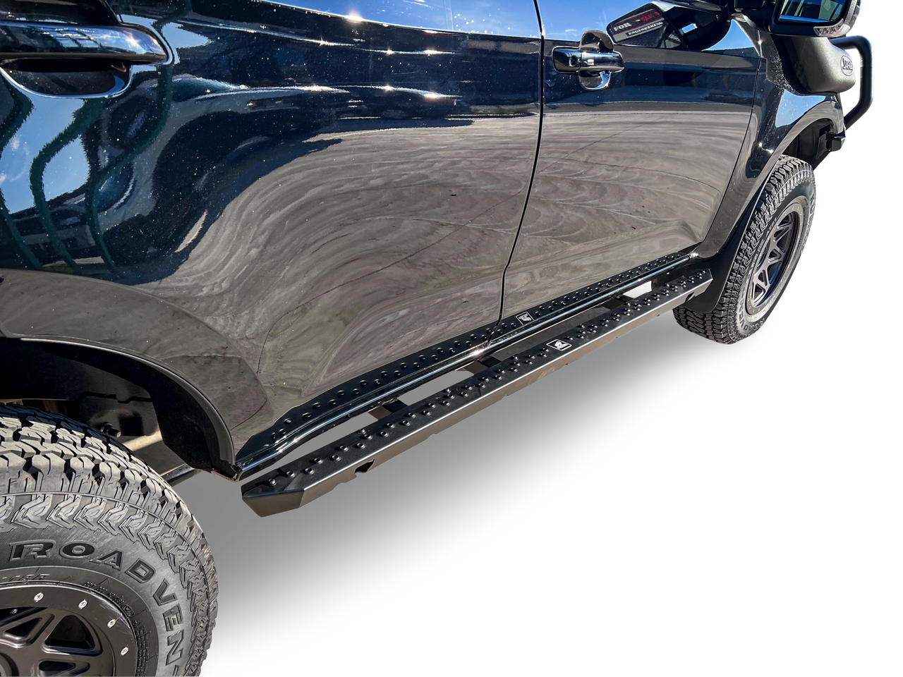 A very innovative design has made these super tough sliders easier to fit than most others. First install the 3 heavy duty steel brackets on chassis, then install our awesome backbone and tread step. The backbone is made from ultra tough 6061 T6 Aluminium extrusion that is designed to be much stronger than any steel section other are using. Being similar in weight and much stronger, it also allows for easy fitment of the steel tread plate step.