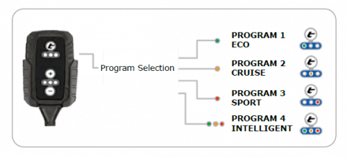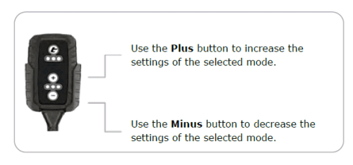 On each of these modes, we suggest that you use the Plus and Minus buttons to increase or decrease the settings in the selected mode. We recommend that you adjust these settings until you find the ultimate response for you. Alternative, you can use Intelligent Mode to find your ideal accelerator response.
