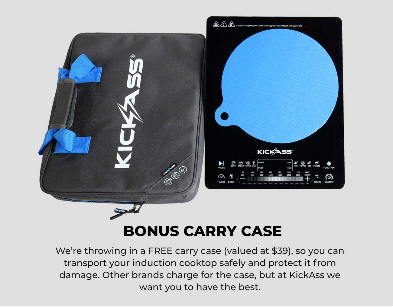 This saves both time and energy, making the KickAss Quickfire induction cooker an environmentally friendly choice BONUS carry case We’re throwing in a FREE carry case (valued at $59), so you can transport your induction cooktop safely and protect it from damage.