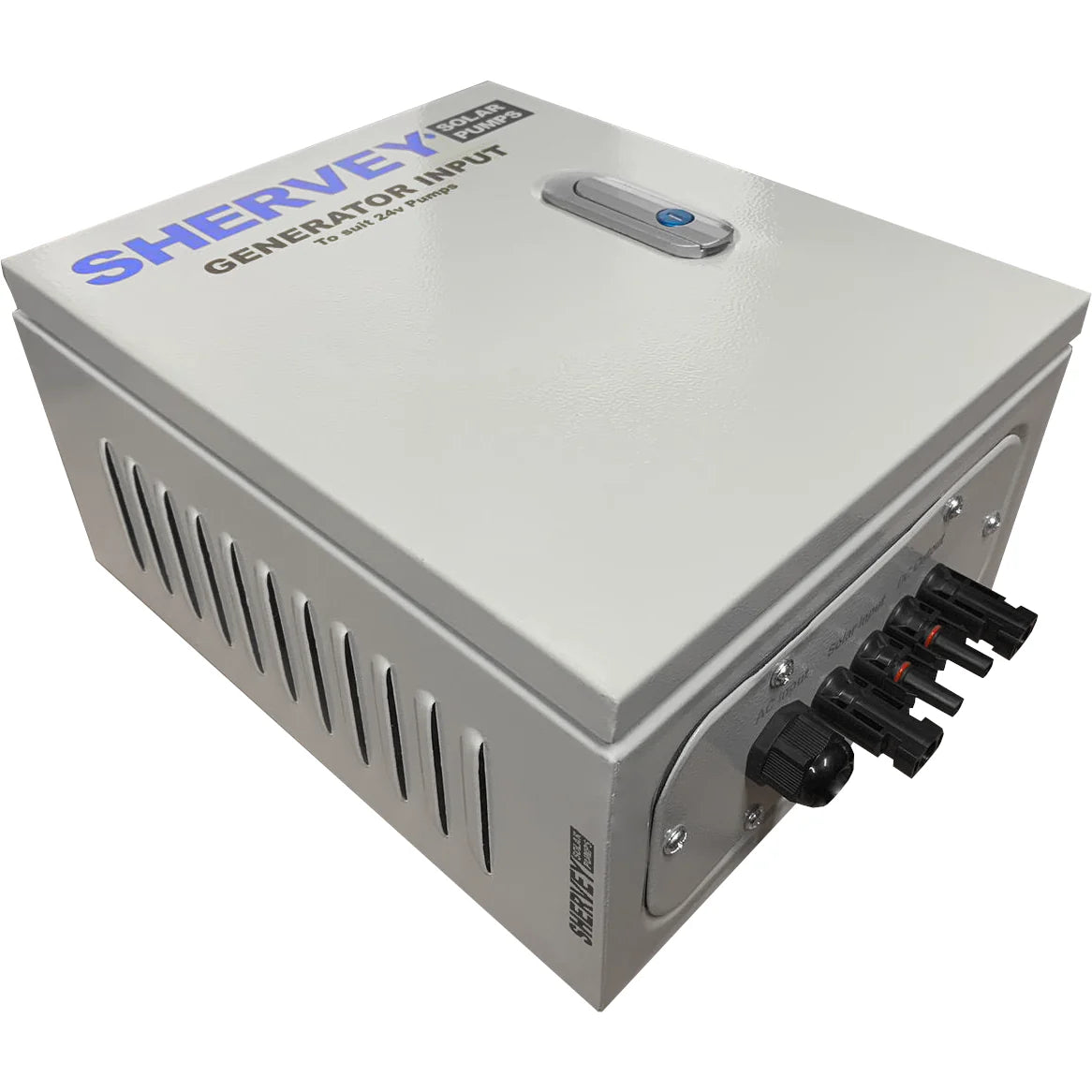 Generator input allows your pump to run from a 240v.a.c. power supply (i.e., generator or grid). Ideal for extra pumping time at night or in poor weather conditions. They come with adaptors that allow them to be retrofitted to existing Shervey Solar Pump systems. A minimum 2 kVA generator is required to run this unit.