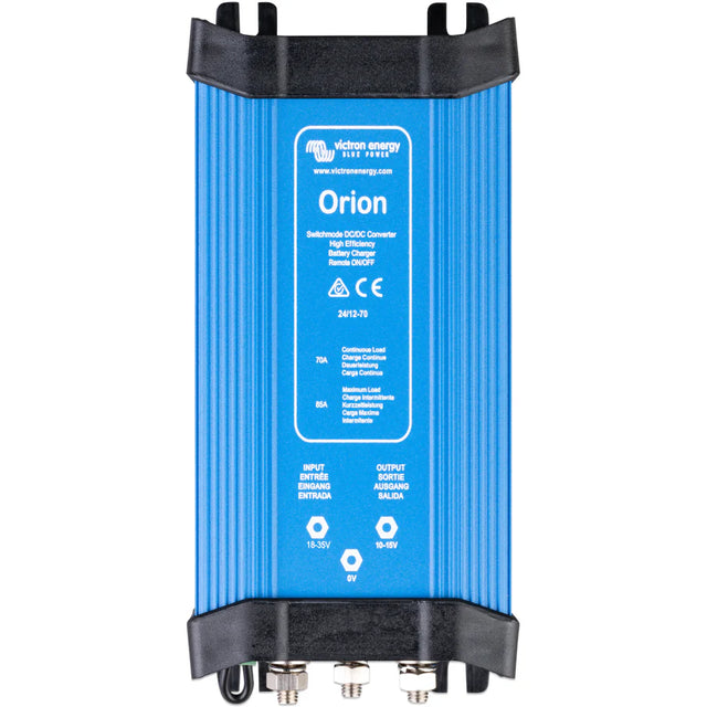 The Orion 24/12-70A DC-DC converter is a high-power, non-isolated converter designed for efficient power conversion. It comes with a remote on-off connector, eliminating the need for a high-current switch in the input wiring. This converter can also be used as a battery charger, especially to charge a 12-volt starter or accessory battery in an otherwise 24V system. Additionally, up to five units can be connected in parallel to increase output current.