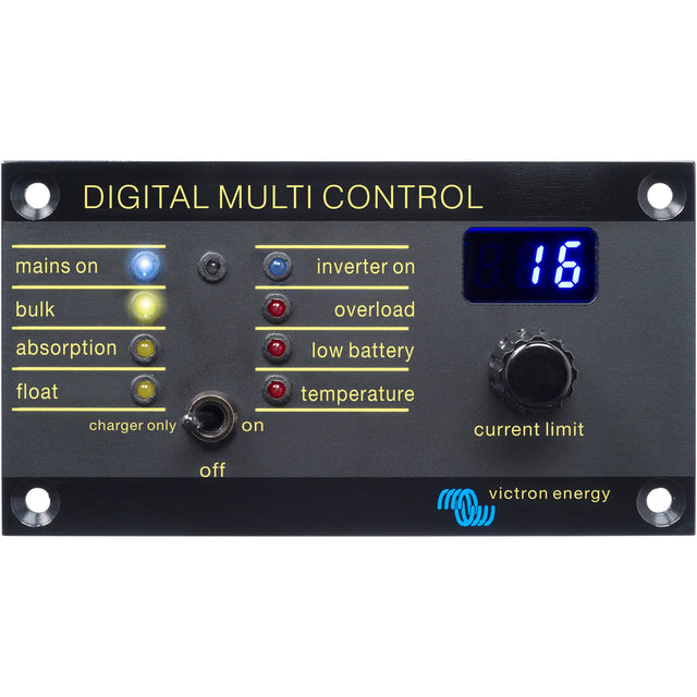 The Digital Multi Control 200/200A (DMC) is a remote panel designed to work with all Multis/Quattro’s and Multi/Quattro systems, encompassing stand-alone, parallel, and 2-3 phase configurations. This panel is intended both for Multis and Quattros. It allows PowerControl and PowerAssist current limit setting for two AC sources, such as a generator and shore side current. The setting range is up to 200 Amps. The brightness of the LEDs is automatically reduced during night time. With the DMC, users can set up to four different input currents (five, including the generator functionality), read out the status of the system, and turn on and off the Multis or Quattro’s.